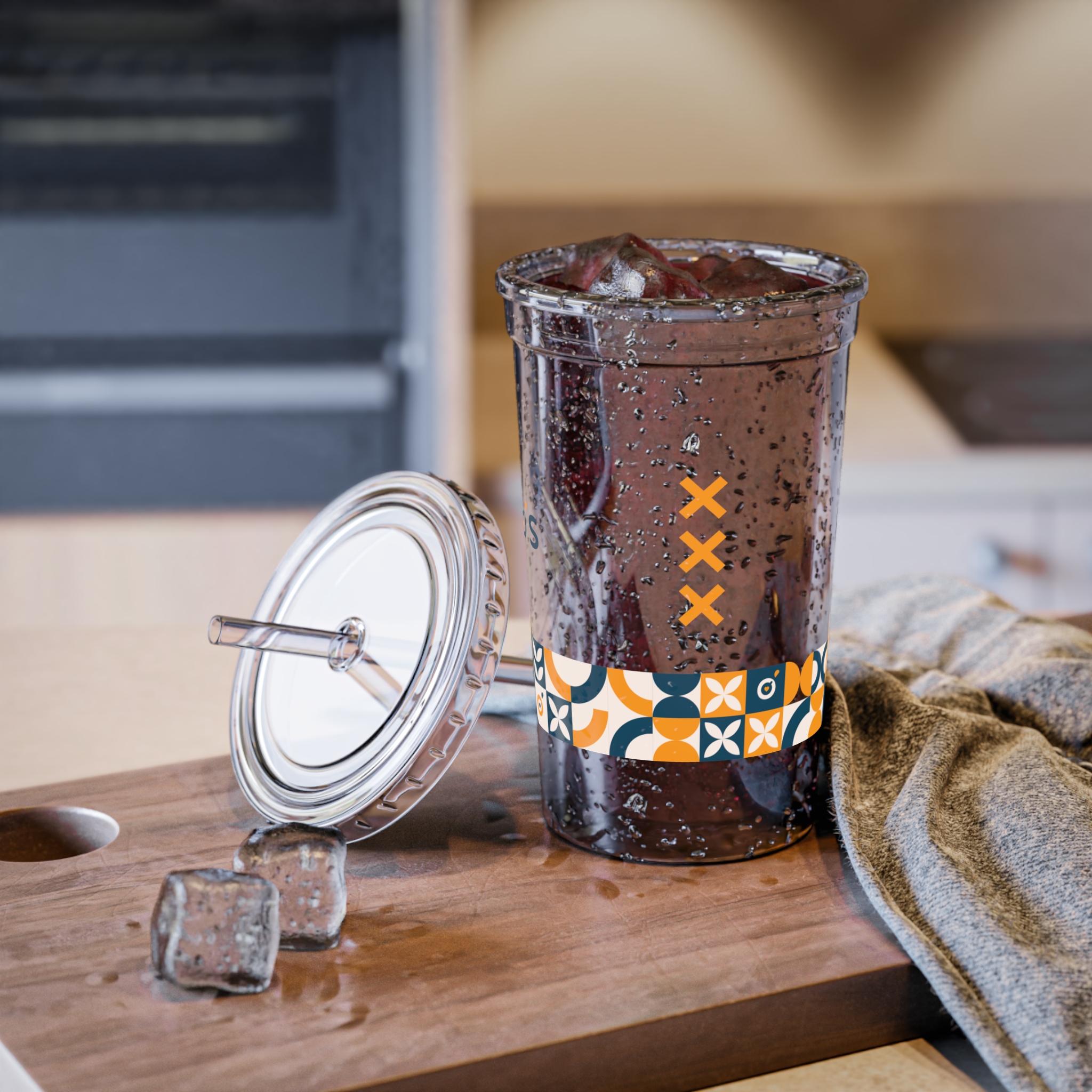 – Includes a durable plastic lid and straw.